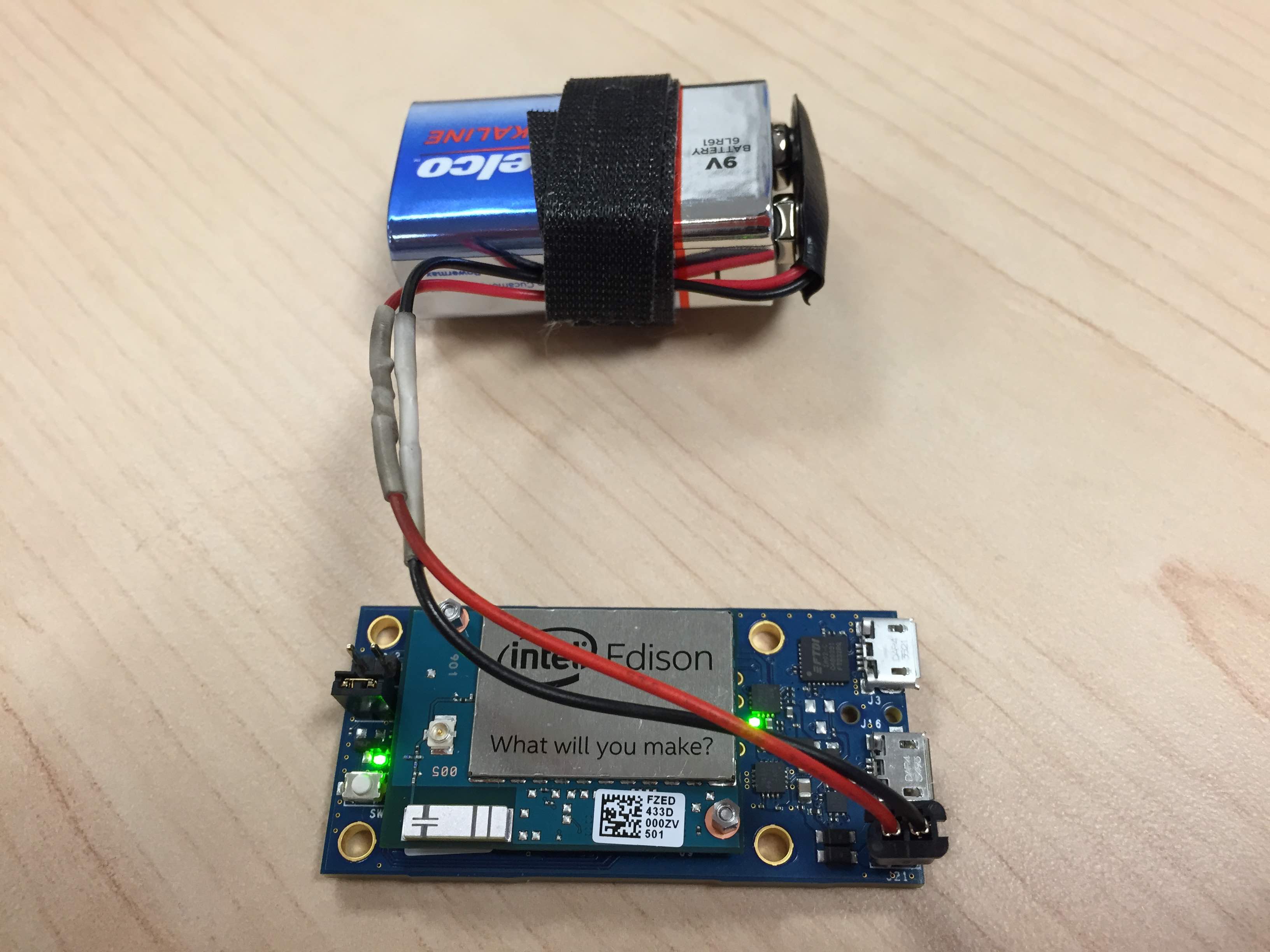 In order to use Edison as a USB host, power must be supplied externally using either J21 or J22. If you supply power with a battery on J2, it will not power the USB connector. So, let's connect a 9V battery to J21: