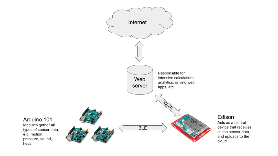 For my first project with Arduino 101, I wanted to combine it with Edison. The two boards complement each other very well. Arduino 101 is a low power sensor module—it comes equipped to measure accelerometer / gyroscope data, but you can easily add other sensors to measure whatever your application needs. Meanwhile, Edison has built-in BLE and Wi-Fi capabilities, as well as enough compute power to gather data from multiple sensor modules, do some basic processing, and send to the cloud. The cloud is then responsible for intensive calculations, analytics, etc.