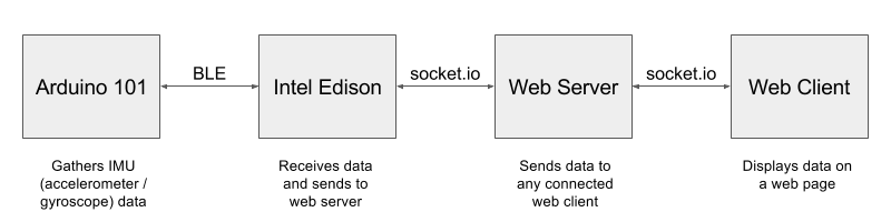 The web server—which also uses Node.js and socket.io—is responsible for receiving data from Edison. From here, the web server can do advanced processing and analytics... but for this demo, it hosts a web page that displays the IMU data. Note that the web page is also a socket.io client—like Edison—but instead of sending data to the web server, its receiving and displaying the data.