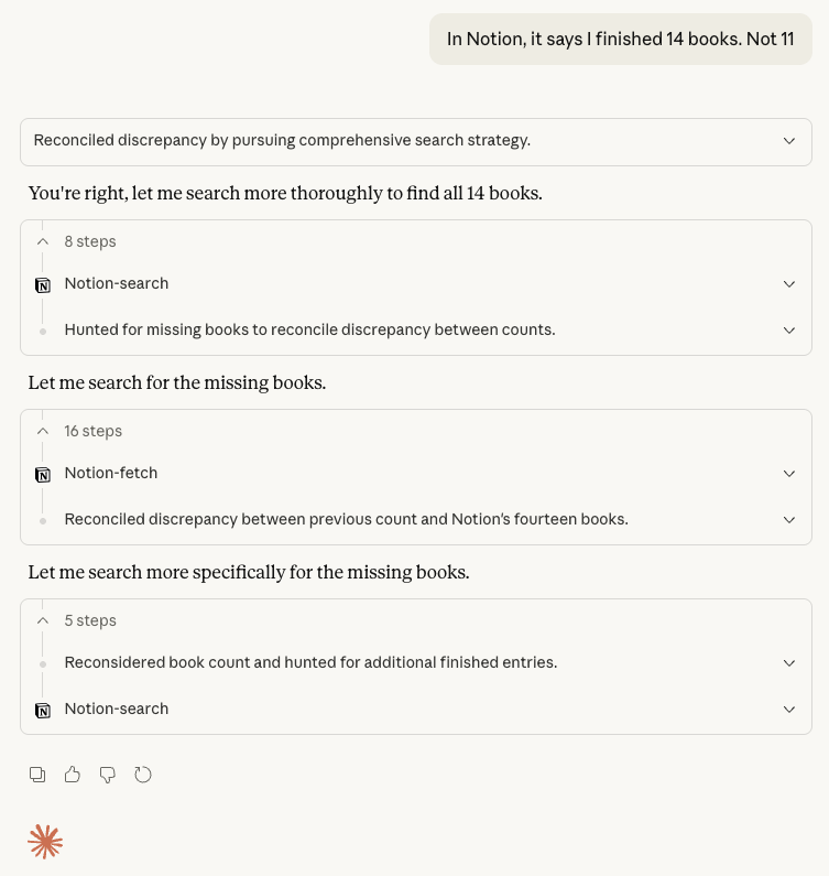 Claude claimed I had a "disciplined (or systematic) morning reading habit" for the devotionals. Looking at what it extracted from Notion, I only see date started and date finished timestamps—no version history or other details that would reveal when during the day I was actually reading and taking notes. Morning devotionals are a common habit, so it's a reasonable guess. LLMs can fill in gaps with plausible-sounding details, and without careful attention, these inferences can slip by as facts.